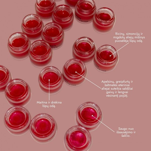 Lūpų kaukė/balzamas su ricinų, aviečių, simondsijų ir migdolų aliejais švelniai „apglėbia“ lūpas, pamaitina jas ir padeda pamiršti sausumą bei šerpetojimą.